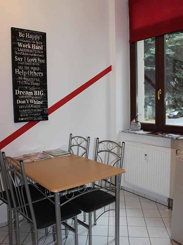 Der Standort befindet sich im Stadtteil Kaßberg, einem der größten Gründerzeit- und Jugendstilviertel Deutschlands. Auch das historische Reihenhaus, Barbarossastraße 20, stammt aus der Gründerzeit. Die hellen Räume im Erdgeschoss mit ihren hohen Decken und großen Fenstern mit Blick ins Grüne bieten eine freundliche Umgebung für Ihre Weiterbildung. Hier findet Ihr Unterricht zwischen 8 und 16:15 Uhr statt. Im Pausenraum können Sie sich zwischendurch eine Stärkung holen; er ist mit Kaffeemaschine, Wasserkocher, Herd und modernen Sitzmöbeln ausgestattet. Auch im Aufenthaltsraum lädt eine bequeme Sitzgruppe zum Entspannen ein. Wer noch etwas zu Essen besorgen möchte, findet verschiedene Einkaufs- und Imbissmöglichkeiten in unmittelbarer Nähe. Der Standort ist außerdem bequem mit öffentlichen Verkehrsmitteln und mit dem Auto erreichbar; kostenlose Parkplätze sind vorhanden.