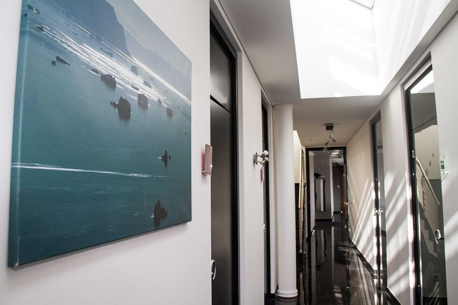 Die Lernpausen lassen sich vielfältig gestalten: Im Erdgeschoss befindet sich ein exklusives Café mit Mittagstisch, und im Sommer ist der beliebte Fischimbiss ein wahrer Geheimtipp, der Meeresfrüchte und Fisch aus der Umgebung anbietet. Im direkten Umfeld befinden sich außerdem das Café und Restaurant Hafenhaus sowie nach fünfminütigem Fußweg entlang der Promenade die belebte Fußgängerzone mit dem Otto Huus, einem Feuerschiff-Restaurant sowie vielen weiteren Highlights.