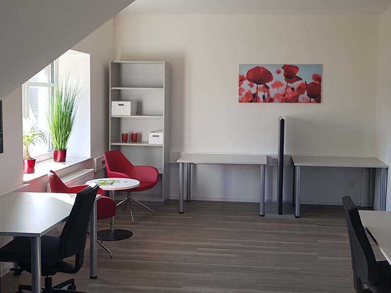 Der Ort für Ihre Weiterbildung ist der frühere Gebäudekomplex der Ibbenbürener Volkszeitung. Die im vorletzten Jahrhundert entstandenen Gebäude wurden aufwändig restauriert und mit einem Neubau zusammengeführt. Ihr Unterricht findet zwischen 8 und 16:15 Uhr im dritten Stock des Hauptgebäudes statt. Die Räume und Zugänge sind barrierefrei gestaltet. Ihr Schulungsraum ist liebevoll und gleichermaßen funktional eingerichtet. Viel Tageslicht und ein neuer PVC-Boden im Parkettstil sorgen für eine einladende Atmosphäre. Der Blick fällt direkt ins Grüne auf den Park. Neben den acht Arbeitsplätzen gibt es auch eine kleine Pausen-Ecke. In der zweiten Etage finden Sie außerdem einen schönen Aufenthaltsraum mit einem Kaffeeautomaten, einem Wasserspender und einer kleinen Teeküche.