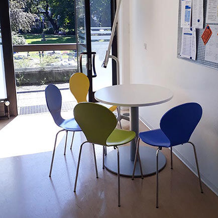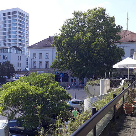 Trotz der lebendigen Lage sind die Schulungsräume in der 1. Etage des Bürokomplexes angenehm ruhig. Ihr Unterricht findet hier zwischen 8 und 16:15 Uhr statt. Die Arbeitsplätze sind in Sechser-Inseln aufgeteilt und dank der großen Fensterfronten schön hell. Besonderer Vorteil: Der große Balkon vor den Fenstern sorgt für sauerstoffreiche Pausen mit Blick ins Grüne des Listplatzparks, in dem Sie sich mittags erholen können. Sie können auch eines der entspannten Straßencafés besuchen oder ein asiatisches Menü genießen. Für die schnelle Stärkung bietet sich der Bäcker im Erdgeschoss mit kleinem Café an. Kaffee und Tee können Sie sich zwischendurch auch in der Küche mit Spülmaschine holen.