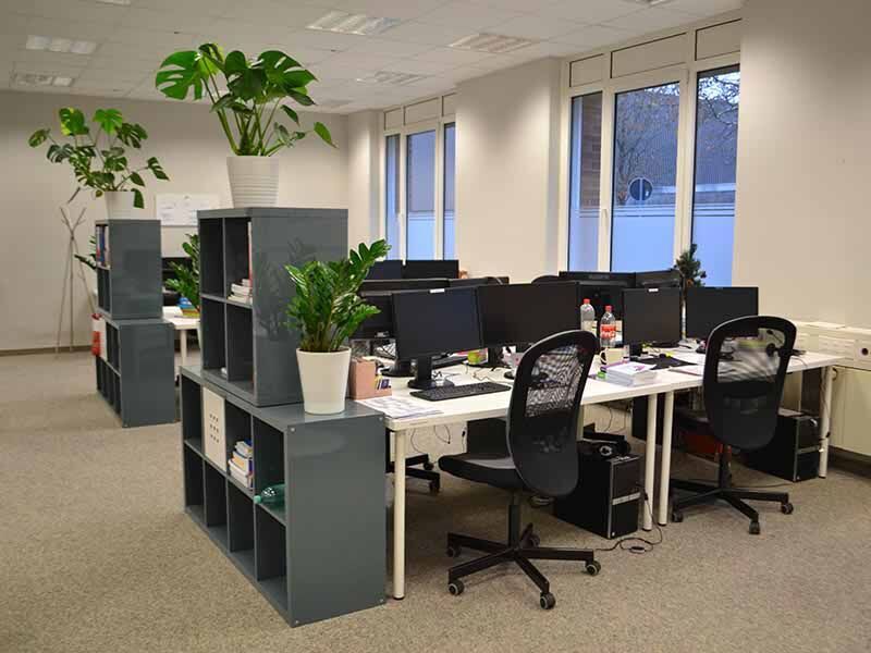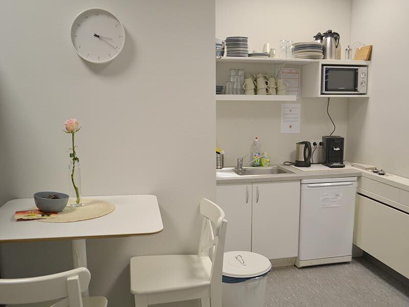 Die Räume befinden sich im Erdgeschoss des großen Bürokomplexes, der unter anderem auch die Agentur für Arbeit, das Finanzamt, den Zoll und die Bundeswehr beheimatet. Der Weg führt Sie durch einen Seiteneingang oder bei Bedarf auch stufenlos über den Hintereingang. Hell und großzügig mit hohen Decken und großen Fenstern präsentiert sich der Teilnehmerraum. Er wird von einer kleinen Küche ergänzt, in der Sie sich mit Kaffee oder Tee stärken können. Kleine Snacks können Sie im Kühlschrank lagern und in der Mikrowelle aufwärmen.