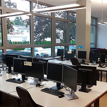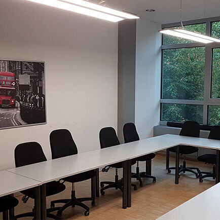 Über eine Treppe (auch rollstuhlgerechter Zugang möglich) erreichen Sie den großzügigen und offenen Eingangsbereich mit Verwaltung/Anmeldung und die Schulungsräume. Ihr Unterricht findet hier zwischen 8 und 16:15 Uhr statt. Hohe Decken, durchgängige Fensterfronten sowie Glaswände und -türen sorgen für ein luftiges Raumgefühl. Die Aussicht geht zum Teil in Richtung der parkähnlichen Anlage mit Bänken hinter dem Haus. Dort können Sie sich in Pausen bei idyllischem Vogelzwitschern entspannen. Wenn Sie lieber drinnen bleiben möchten, machen Sie es sich auf der Sitzecke gemütlich. Hier im Pausenbereich finden Sie auch einen Automaten für erfrischende Kaltgetränke sowie einen Kaffeeautomaten mit verschiedenen Heißgetränken. In der kleinen Küche stehen Kühlschrank, Geschirr, Spülmaschine und Wasserkocher bereit. Viele Teilnehmer nutzen die Mittagspause auch für einen Spaziergang zum Limpurger Platz, einem kleinen belebten Marktplatz, um sich etwas zu essen zu holen. In der anderen Richtung liegen ein Discounter und Getränkemarkt.